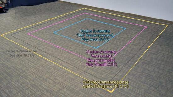Oculus Rift有三个支持Roomscale空间追踪技术的尺寸,最低空间要求是2x1.5米,最大空间尺寸为2.5x2.5米,如果只使用2个传感器,那么最低空间可减少到1.5x1.5米。